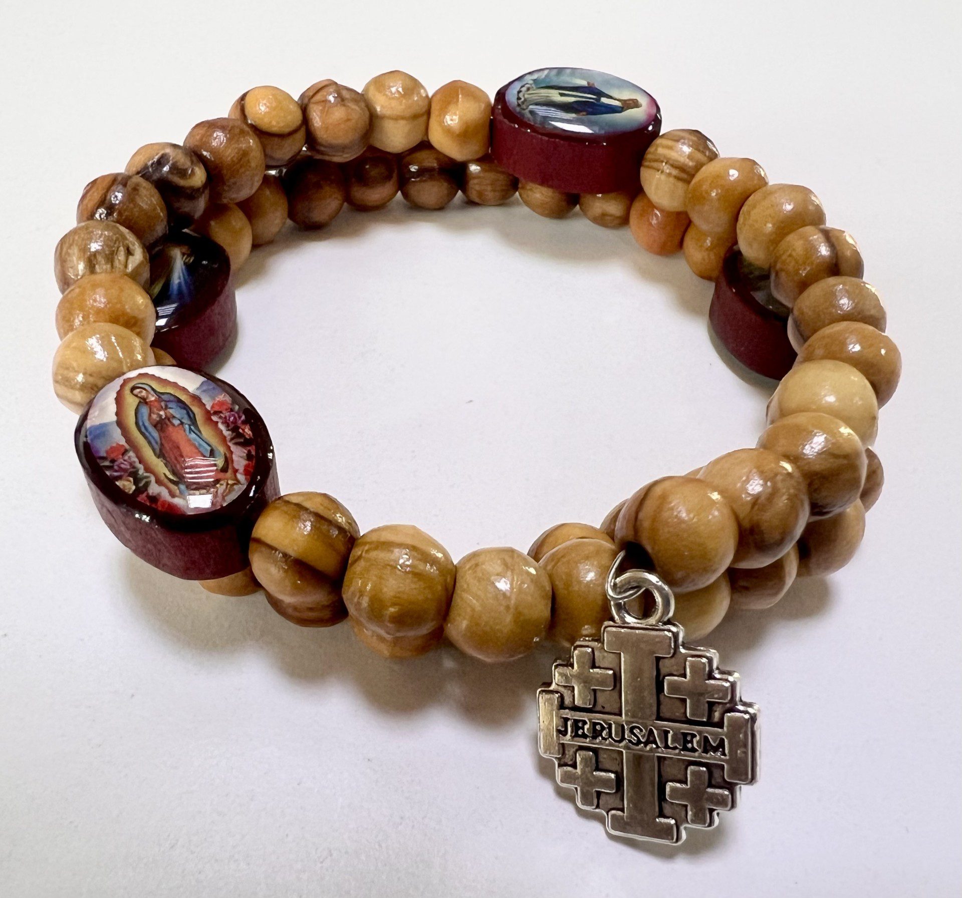 Een dagelijkse bron van inspiratie en bescherming. Deze rozenkransarmband met heiligenmedailles is met de hand gemaakt door christenen in Bethlehem. De kralen zijn van echt olijfhout, met een warme en natuurlijke uitstraling. Tussen de tientjes bevinden zich medailles met afbeeldingen van heiligen, die ieder hun eigen voorbeeld en voorspraak meebrengen.