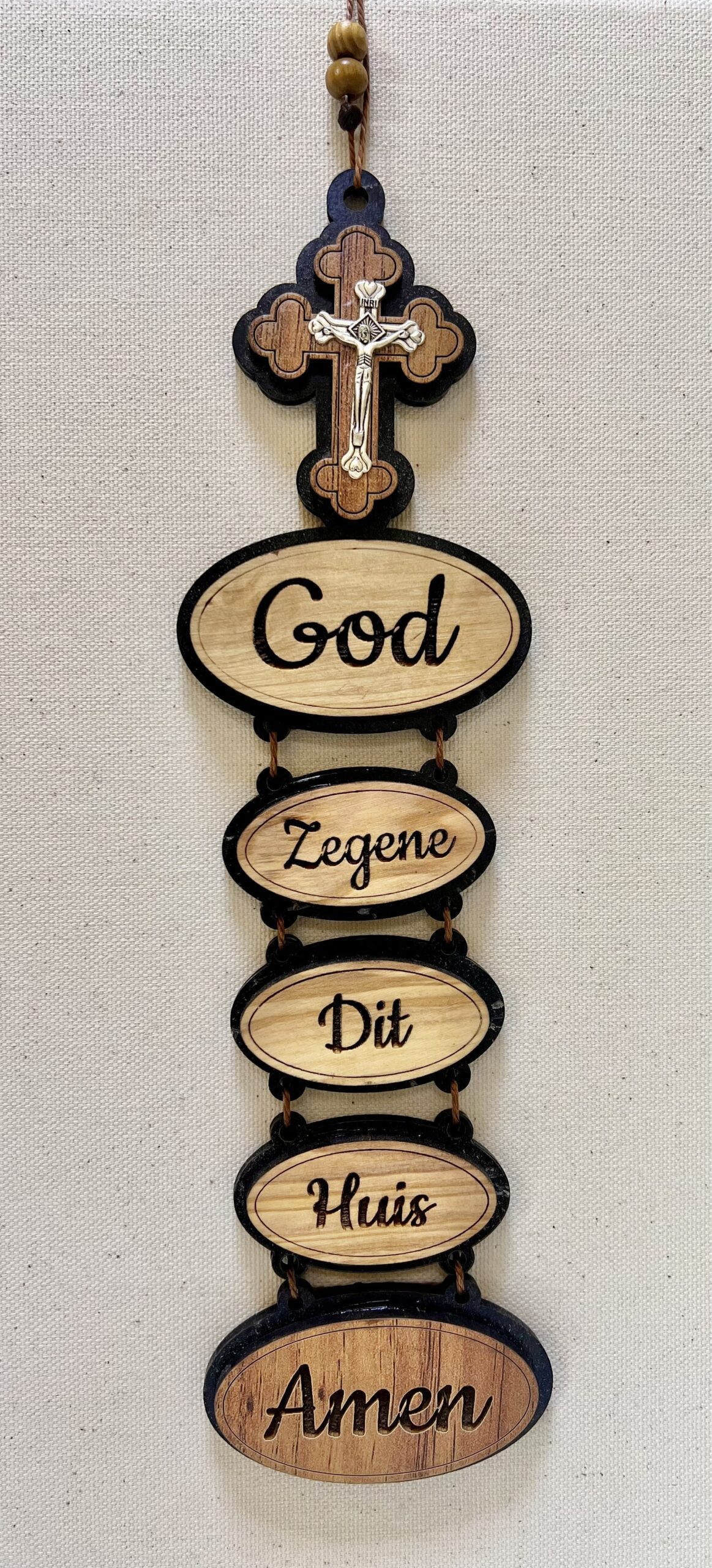 Geef uw huis een zichtbaar teken van geloof en vertrouwen met deze prachtige huiszegen van olijfhout. De woorden “God zegene dit huis. Amen.” zijn gegraveerd op vijf olijfhouten plaatjes, verbonden onder een kruis met corpus. Een warm en krachtig gebed dat elke dag herinnert aan Gods aanwezigheid en bescherming.